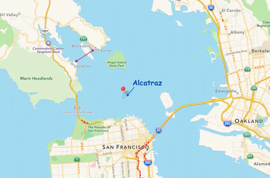 Thanks for the additional information. Al Capone wasn't on the first boatload of prisoners but arrived a few months later. I've been to Alcatraz once, back in 1983.Oh yes, Alcatraz - Al Capone was an early occupant and may have been on that first boatload - for those not aware of its location, the island is in the beautiful San Francisco Bay (see map below) - easily seen from the pier area and also from the towns of Sausalito & Tiburon (connected red arrow) - Susan & I have been to the latter towns many times for shopping & lunching (usually via ferry) - Alcatraz is now a National Park and can be visited - been there a few times and recommended; of course, Bay cruises pass near the former penitentiary. Dave