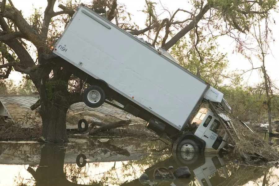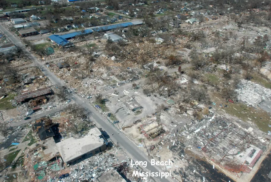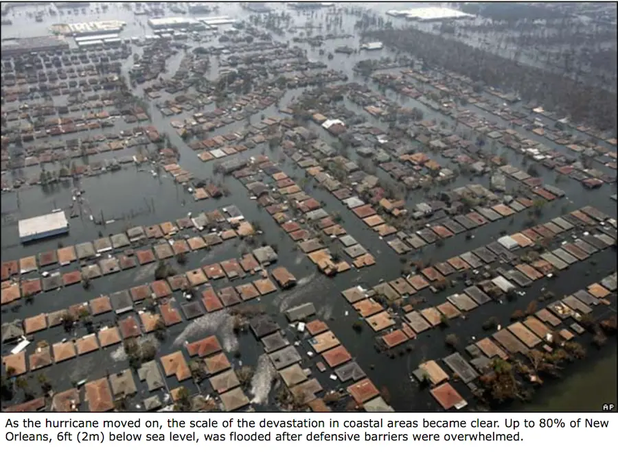 Katrina caused severe destruction along the Gulf coast from central Florida to Texas, much of it due to the storm surge. The most significant number of deaths occurred in New Orleans, Louisiana, which flooded as its levee system failed, in many cases hours after the storm had moved inland.[4] Eventually 80% of the city and large tracts of neighboring parishesbecame flooded, and the floodwaters lingered for weeks.[4] However, the worst property damage occurred in coastal areas, such as Mississippi beachfront towns; over 90 percent of these were flooded.