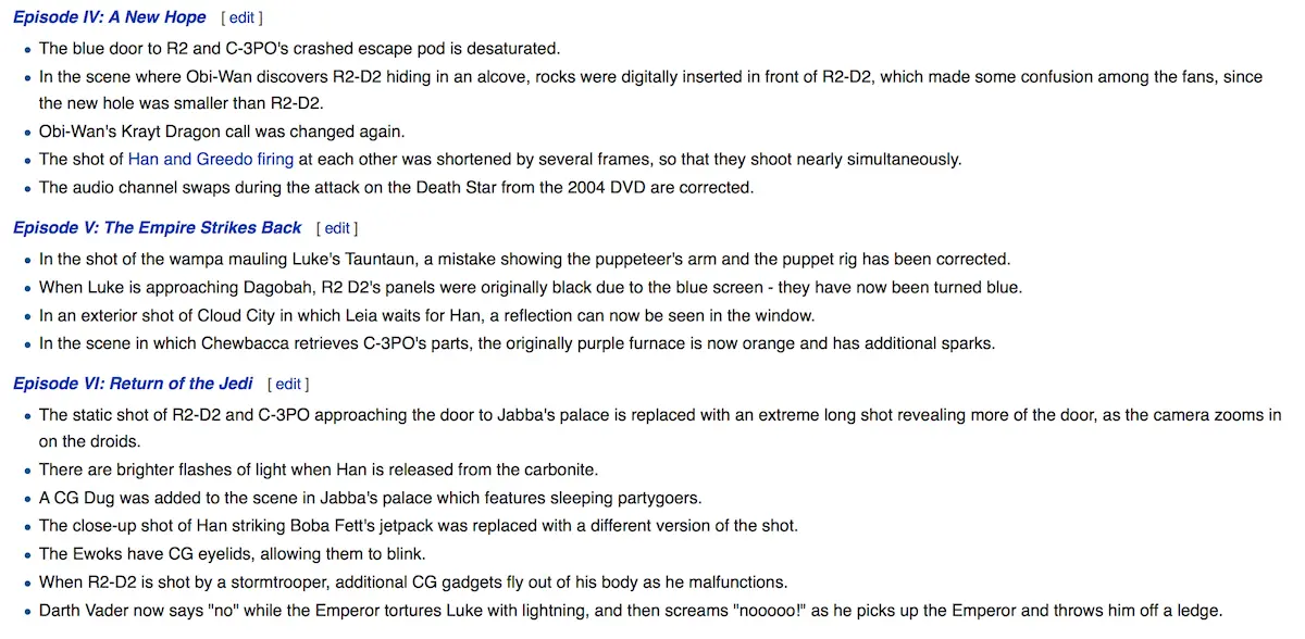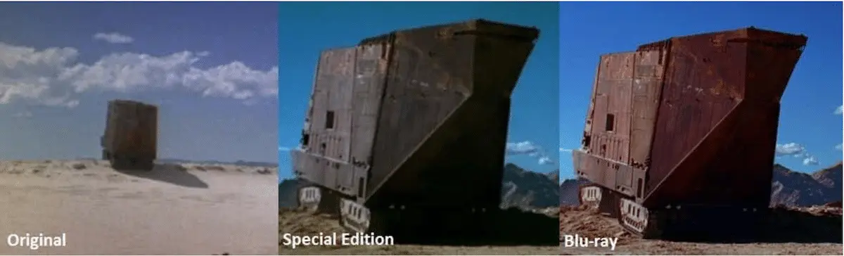 Some of these changes are shown in the second image (Source) - the last two pics are several visual alterations made. I don't believe that the 'original theatrical' releases of these films have been put on blu-ray yet, or never will - an irritation to some critics and reviewers - not sure that I care that much, i.e. my BDs are completely acceptable and enjoyable, just my 2 cents!Dave