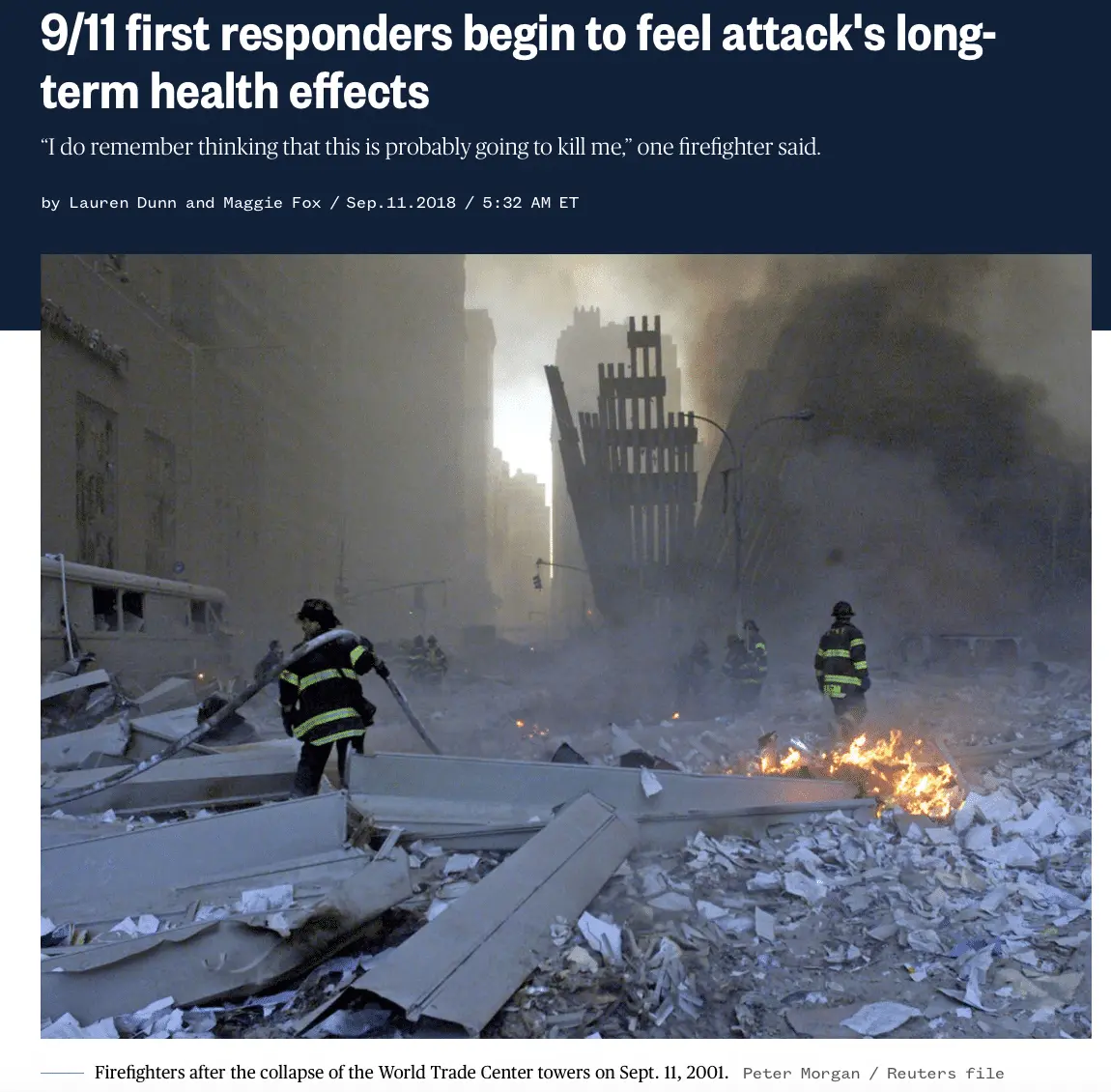 There was a similar situation among the survivors of the atomic bomb attacks at Hiroshima and Nagasaki. Survivors are still dying from the effects of radiation exposure over 70 years later.Concerning the 9/11 disaster, there was an article in USA Today about the increasing numbers of first responders and survivors who are dying from diseases related to the event, particularly cancer - the mortality rate is approaching that of those killed on that day and will easily exceed that number in the upcoming years - another news story HERE - Dave
