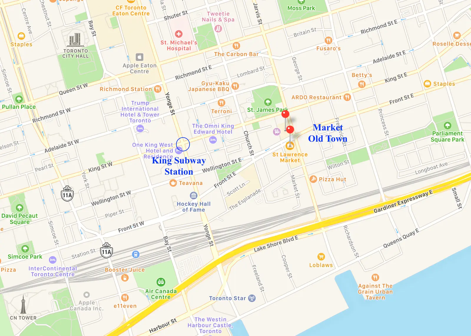 The Toronto Islands (formerly known as Island of Hiawatha and also known as Menecing, meaning "On the Island" in the Ojibwa language) are a chain of small islands in Lake Ontario, south of mainland Toronto, Ontario, Canada. Comprising the only group of islands in the western part of Lake Ontario, the Toronto Islands are located just offshore from the city centre, and provide shelter for Toronto Harbour. The islands are home to parkland, the Billy Bishop Toronto City Airport, several yacht clubs, Centreville Amusement Park, and Hanlan's Beach. The island community is considered to be the largest urban car-free community in North America, although some service vehicles are permitted. Access to the Islands is by ferry, including the City of Toronto ferries operating from Jack Layton Ferry Terminal at the foot of Bay Street, or by water taxis. (Source)