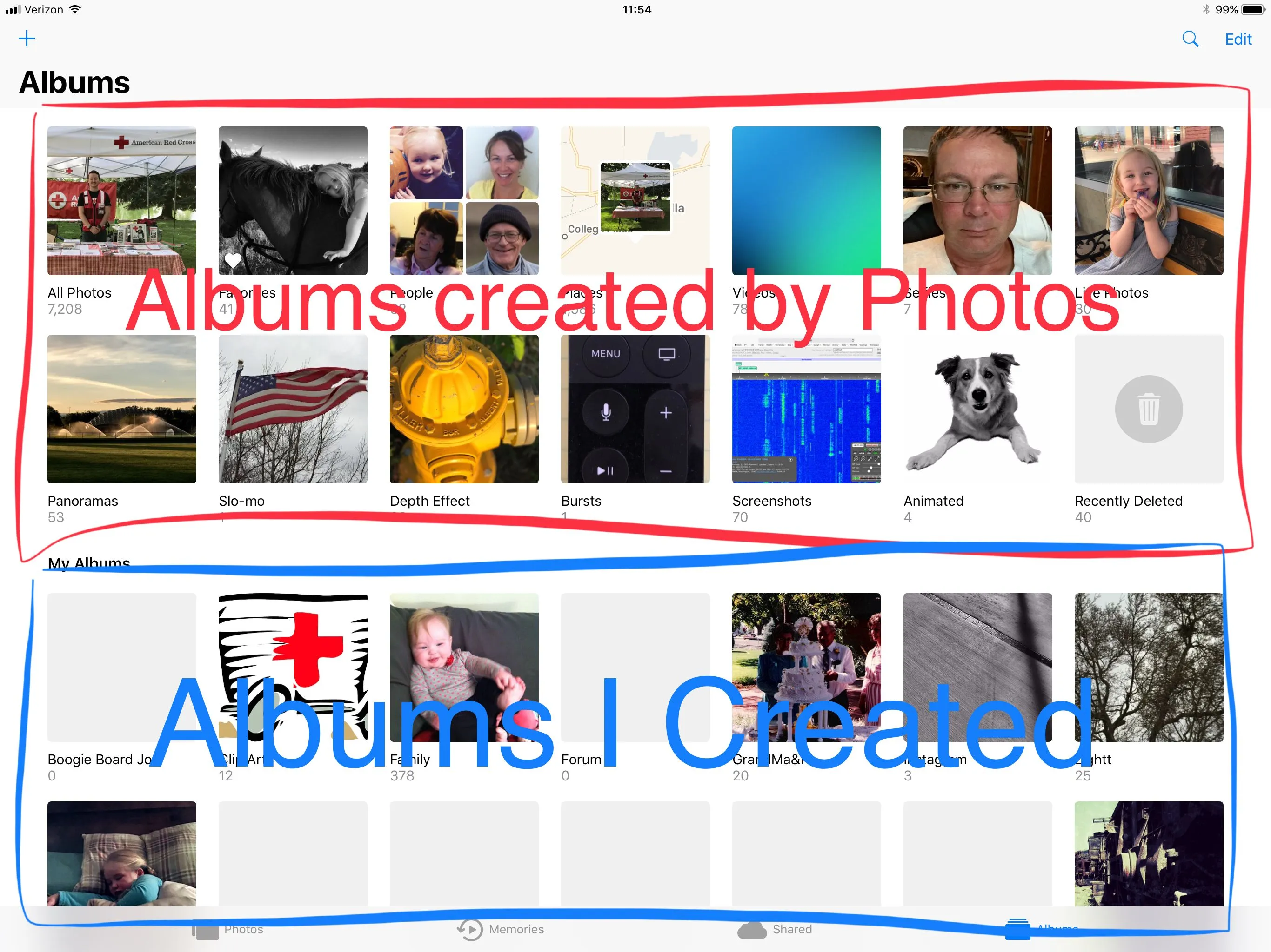 thanks this is just what i have been waiting for i am a new user on ipad with ios 11 an have just loaded 5000 photos to icloud but they are all spread around so sorting them into albums will be great thanks once againGayed out albums are typically the ones automatically created by Photos for specific catagories of photos: Bursts, panoramics, videos, etc. You can't add photos to these albums manually.