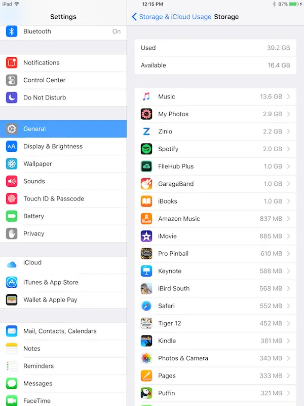 I started installing a few apps and I wanted to know how much space they take up. I checked it's storage capacity (General > About) and it read Capacity 55,6 GB, Available 50,3 GB. I take it this means the operating system iOs 9.3 uses 8,4 GB and the apps I installed + some photo's use 5,3 GB.