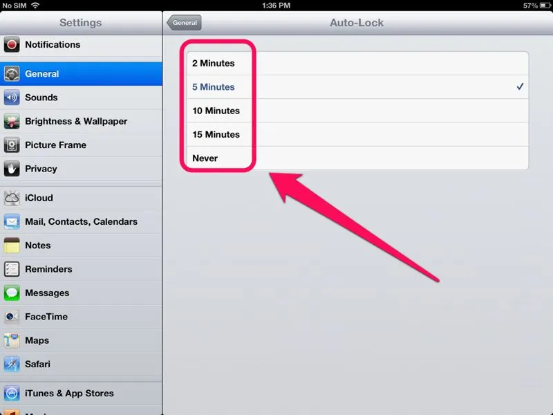 so many times while im working out a problem it takes a couple of minutes for me to touch the screen again or have any activity on the mini. The screen turns off and i have to push the home button in order to come back to where i was. Is there any setting that will give me a little more time before it goes to sleep mode?