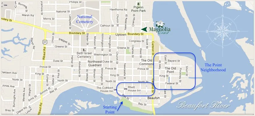 Beaufort, South Carolina is the second oldest city in the state after Charleston (late 1600s vs. 1711 - see quote) - from our home about a 5 hr drive (see first pic below) - the town is located among dozens of sea and barrier islands, located on Port Royal island which also has a town of the same name (second pic) - see description below w/ link above; the historic section of 19th century architecture is large (and occupies much of the aerial view shown); there are many local attractions and great history and seafood (later) - this is probably our 4th visit but all others were 'day trips' - this time we are staying for 3 nights at the Beaufort Inn (also shown) which is just a block from Bay Street, the main street near the water and location of plenty of restaurants and shops, especially those related to art, antiques, etc.