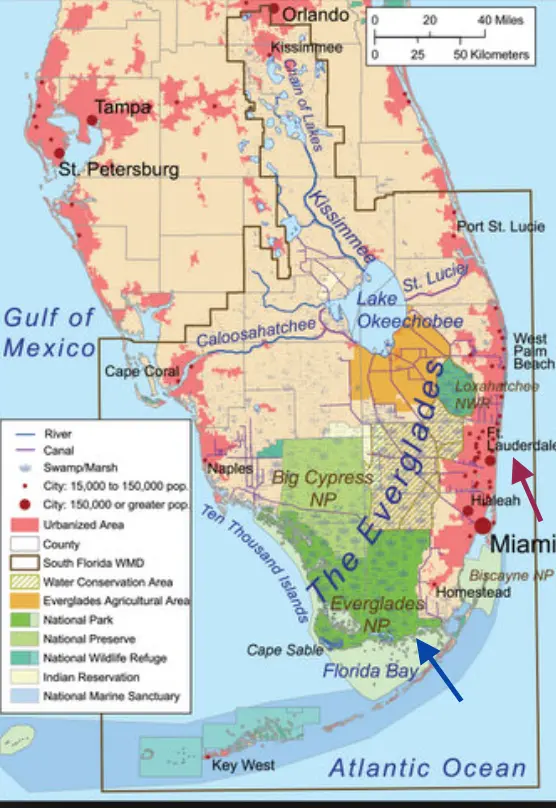 The American Croc used to range from the Everglades to New Orleans in salt water swamps (the alligator prefers fresh water). If you go down to Flamingo in March you should be able to see them - but like all wildlife, they don't show up on every visit. You can definitely tell the difference, as they have a very pointed snout and are a different color grey than the gators.