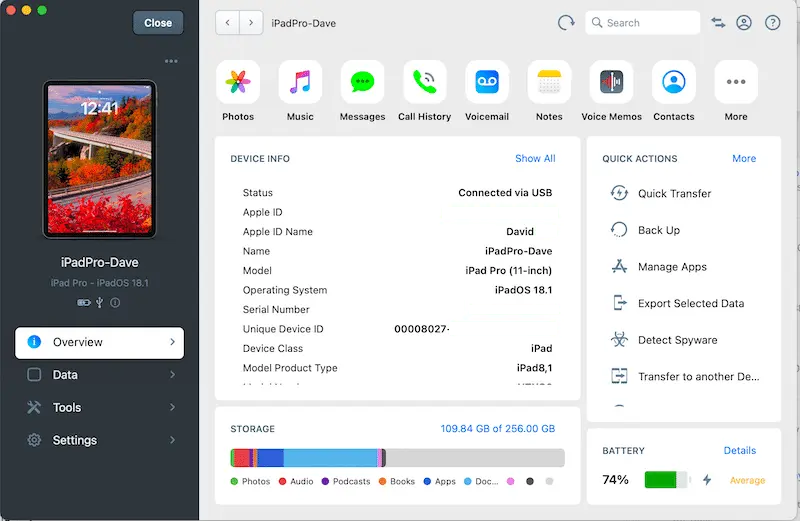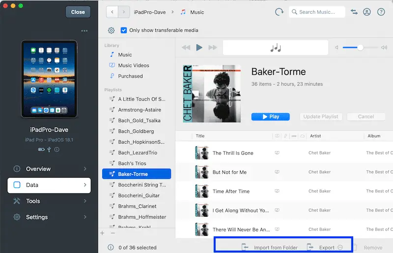 Thanks. I’ll take a look.Well, let me suggest an alternate app called iMazing (versions available for PC or Apple) - there is a purchase price but much versatility is provided (look at the link, if interested). As a brief example, I've attached my iPadPro to my MBAir - the first pic shows the options lined at the top (and many more; I've deleted some of my personal info). Tapping on 'Music' brings up the second pic showing all of the music on my iPad (mainly as playlists); noticed the blue box at he bottom - those functions allow you to import or export music to you device(s). Dave