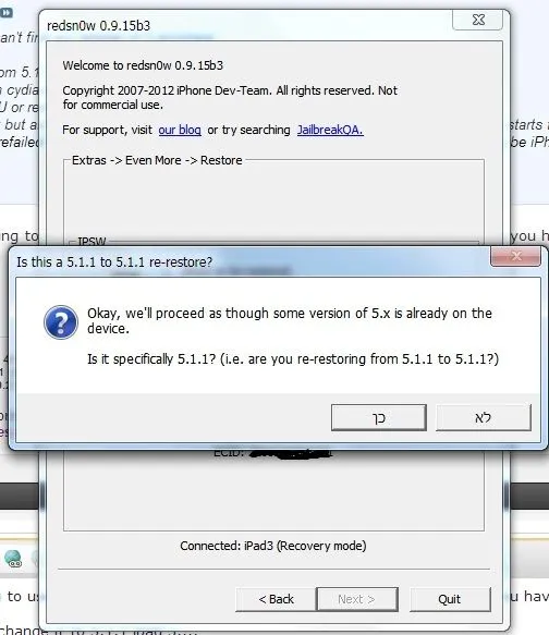 the error which i get is: "Re-restore failed You might have guessed the current FW incorrectly, and it may not really be iPhone3,3_5.1.1_9B206"