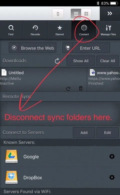 The second method is clumsier. Turn on the Wi-Fi drive feature at the bottom left of the control panel. Using a desktop or laptop computer enter the URL address provided. You’ll get a web page that will let you browse and download your files from the GoodReader app. It’s not a great interface. You’ll have to download them one at a time, and deal with them like any other file you downloaded in a web browser; but it’s better than nothing.