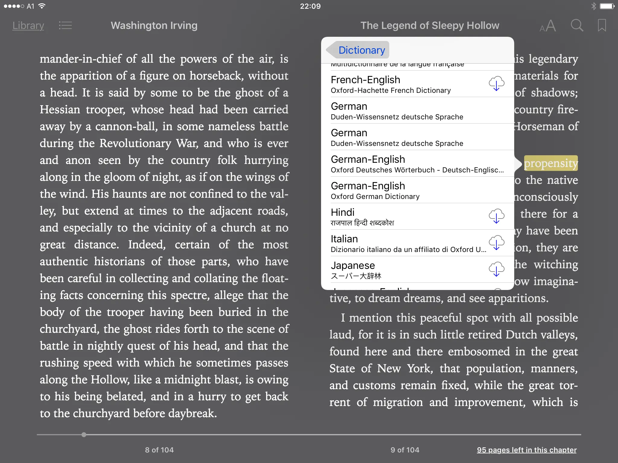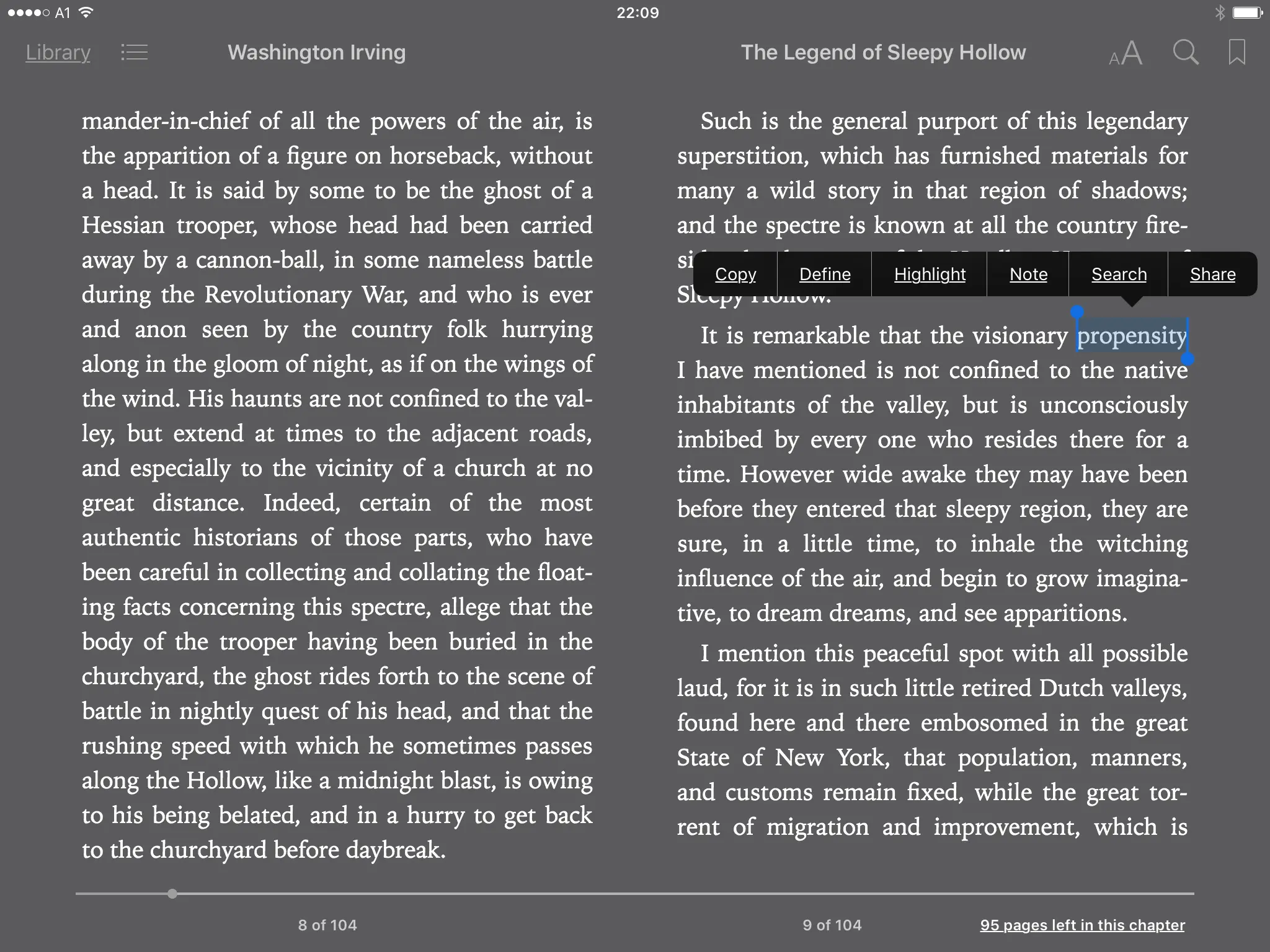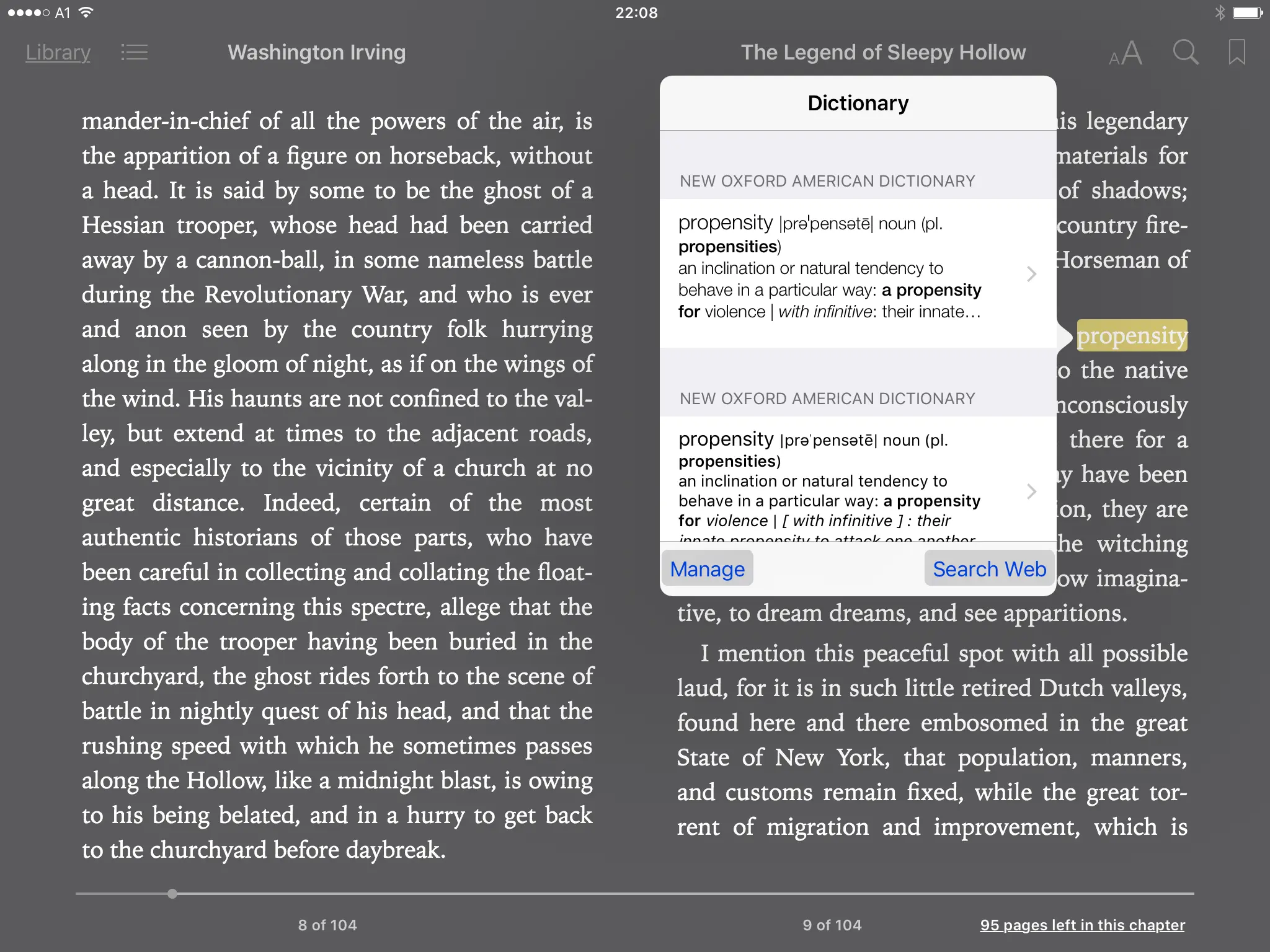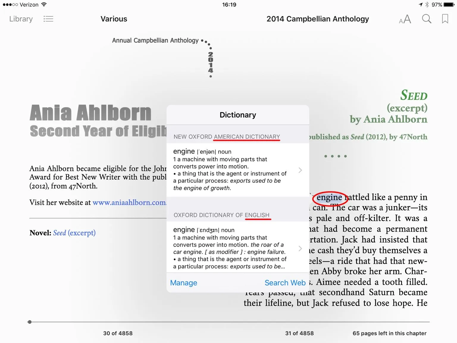 When you open a book or PDF file, and tap and hold on one of the words, you'll get a popup: