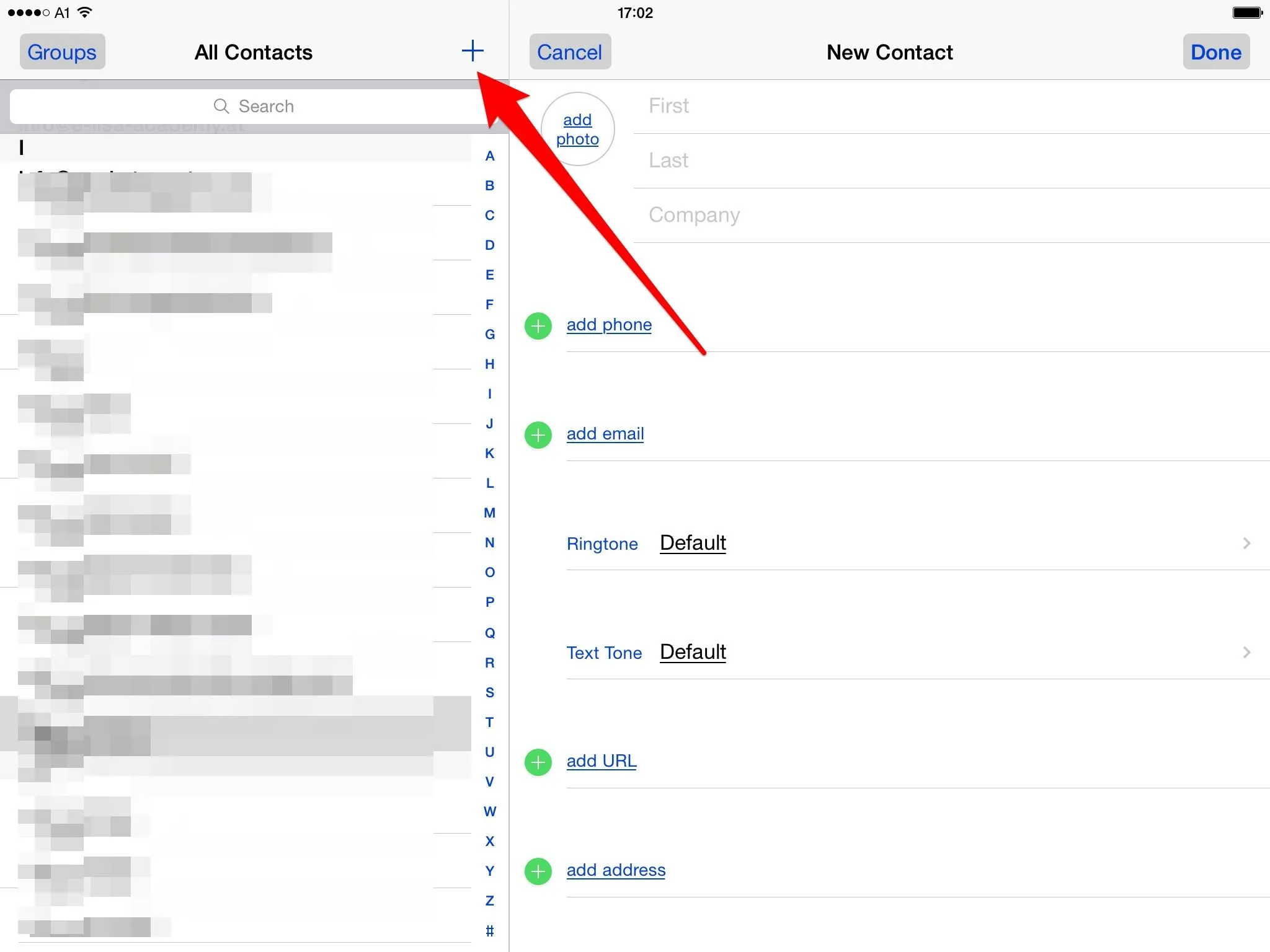 To add a contact, tap the + here: