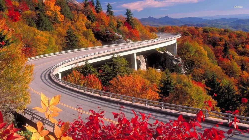 Those fall colours are just stunning! Most of the leaves on the trees where I live just turn yellow in the fall.In the fall & early winter, we've occasionally traveled to the North Carolina Mountains but a little reluctant to get trapped in a major snow storm - below are some of the fall colors in the vicinity - one of my favorite spots on the Blue Ridge Parkway (BRP) is Linn Cove Viaduct (last part of the BRP completed), which runs around the base of Grandfather Mountain (near Blowing Rock, a quick get-away for us) - the fall colors there are just breath-taking, as you as see from two different perspectives of the structure.