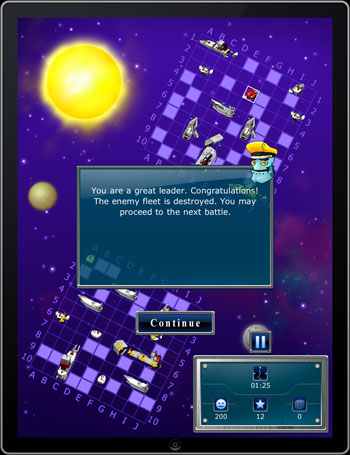The game basically plays a lot like a fancy version of Battleships, with players getting the chance to participate in 60 grid-based battles across three different themed areas – World War I, Pirates and Science Fiction. Each theme has its own dedicated music and sound effects. You start Navy Career mode as a lowly Ensign, and climb up through the ranks to eventually become Fleet Admiral. On the way up the career ladder you can also earn medals, titles and rewards.