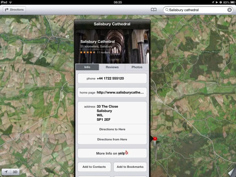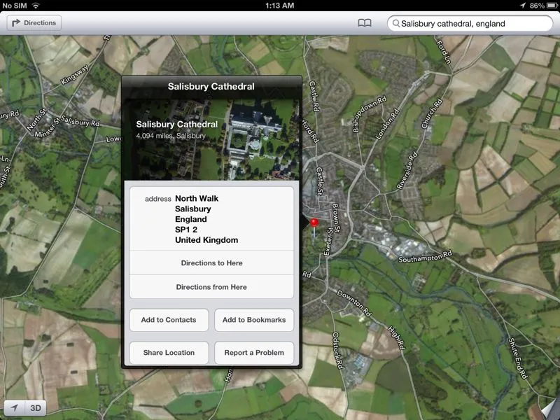 Trying to change the address of Salisbury Cathedral on imaps. Would you believe I've tried this 5 times and its still in a village (Downton) with Yelp info. Richard, could you please do this as well. I find it offensive that our beautiful cathedral is wrong on Apple maps.