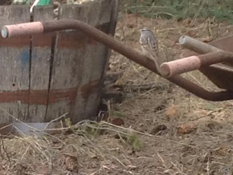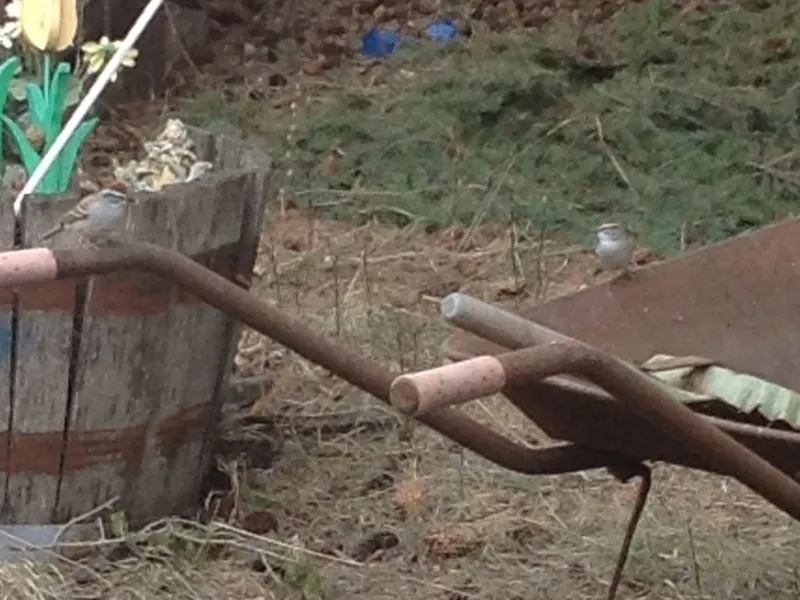 Here's a photo of two sparrows on an old wheelbarrow in my yard. The one on the left is a Chipping Sparrow and the one on the right is a White Crowned Sparrow.
