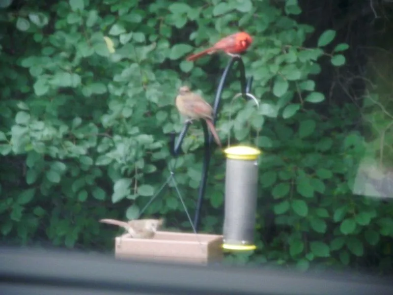 The cardinal photo is of one of the young ones. Here's a fuzzy phot of papa, momma, one of the youngsters.
