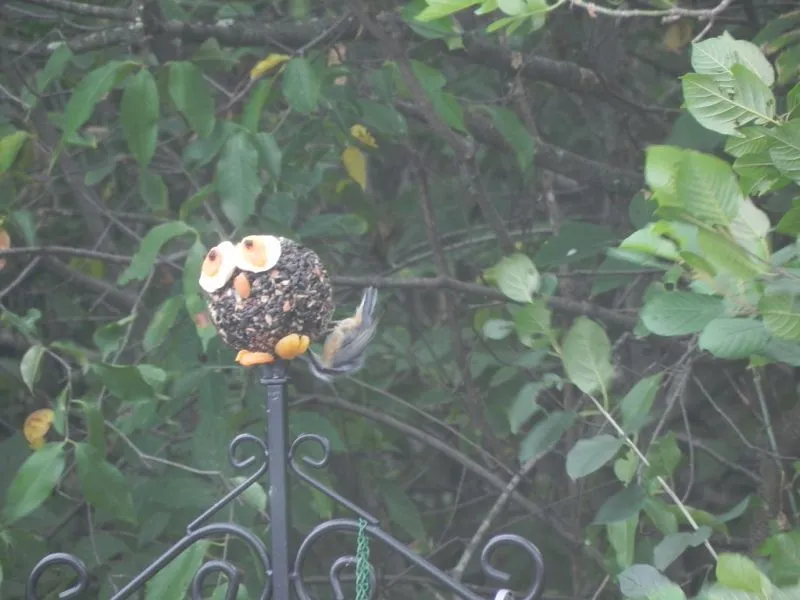 Hoot is seeds, nuts, and fruit and gelatin. So far chickadees, nuthatches, cardinals, redbreasted grosbeaks, and a brown thrasher have had a taste of him.