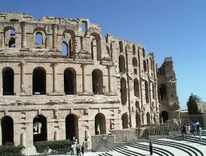 It's the ruins of the Roman amphitheatre at El Jem, in Tunisia. When complete it was the third largest apmphitheatre in the Roman world.What is the building shown in the picture and where in the big round world is it located?