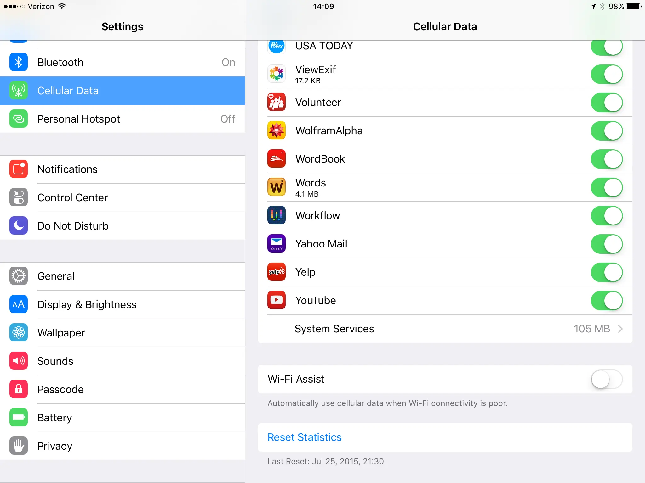 For those of you with cellular iPads and cramped data plans, be sure to go to Settings > Celular Data and turn off Wi-Fi Assist. It is at the very bottom of the celular settings page.