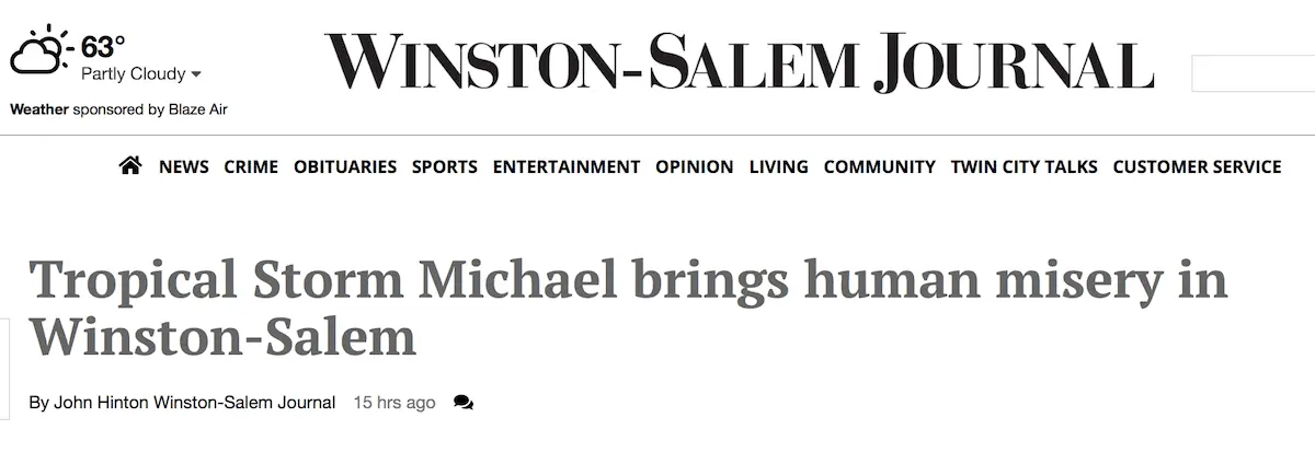 I'm glad the damage wasn't nearly as bad as down in Florida. I hope it doesn't take too long to recover.Tropical Storm Michael Hits the Triad w/ Flooding, Fallen Trees, & Electrical Outages